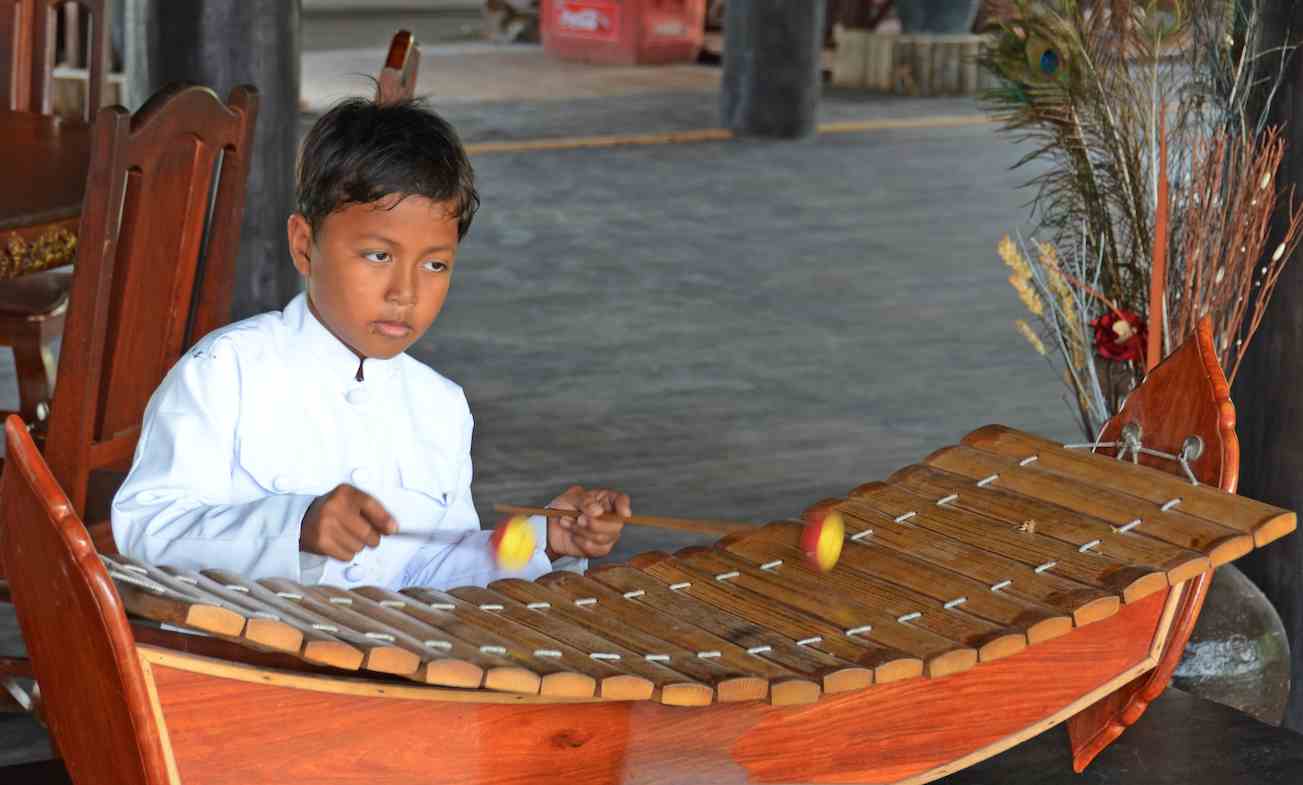 Around midday we took a break for lunch at a restaurant in a little village. It was a new building built in traditional style and is being established as a Home Stay accommodation to Angkor tourists. Lunch was very nice and we had the place to ourselves. In the background was a boy playing a , a Cambodian wooden xylophone in the shape of a boat.