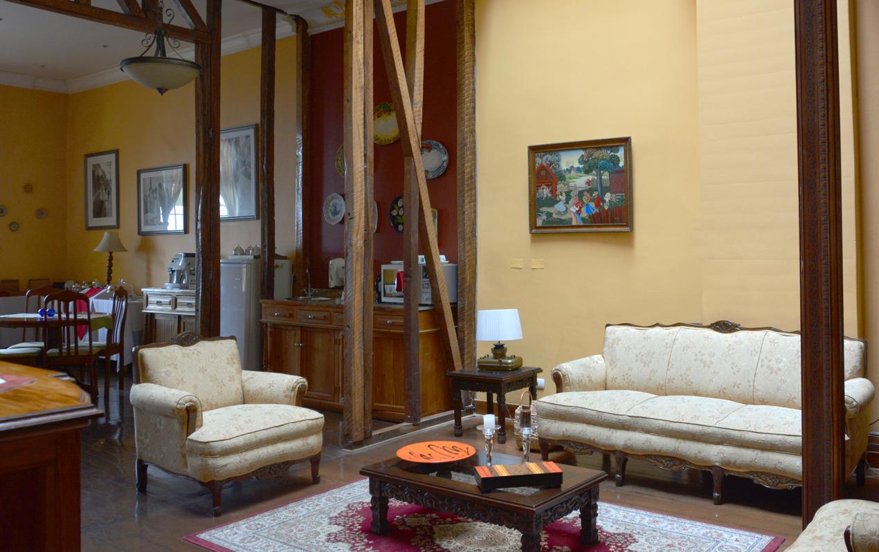 Some of the walls have been demolished to make the space larger and some of the wall framework timbers have been left in place which gives a rustic look.