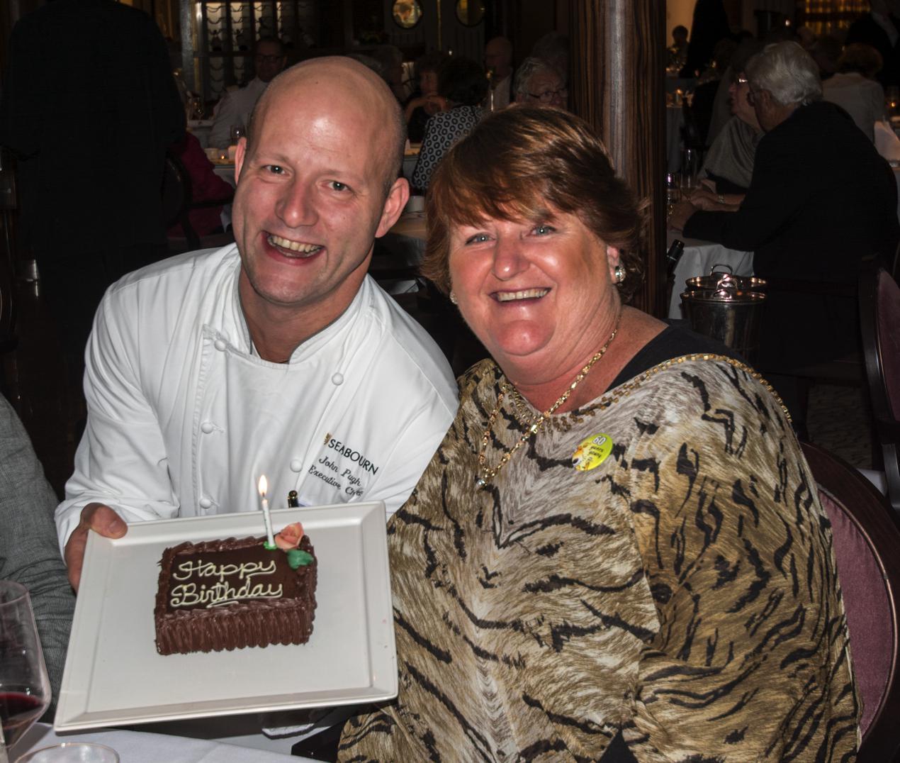 The Raison D’etre for this cruise was to celebrate Sue’s 60th birthday, which was on October 25th. The chef was going to prepare a menu that Sue had designed but that night was the Chefs Dinner which is a special affair in its own right, so we elected to have the Chefs Dinner menu and the chef prepared our special menu the next night, which extended the birthday celebrations over two days.