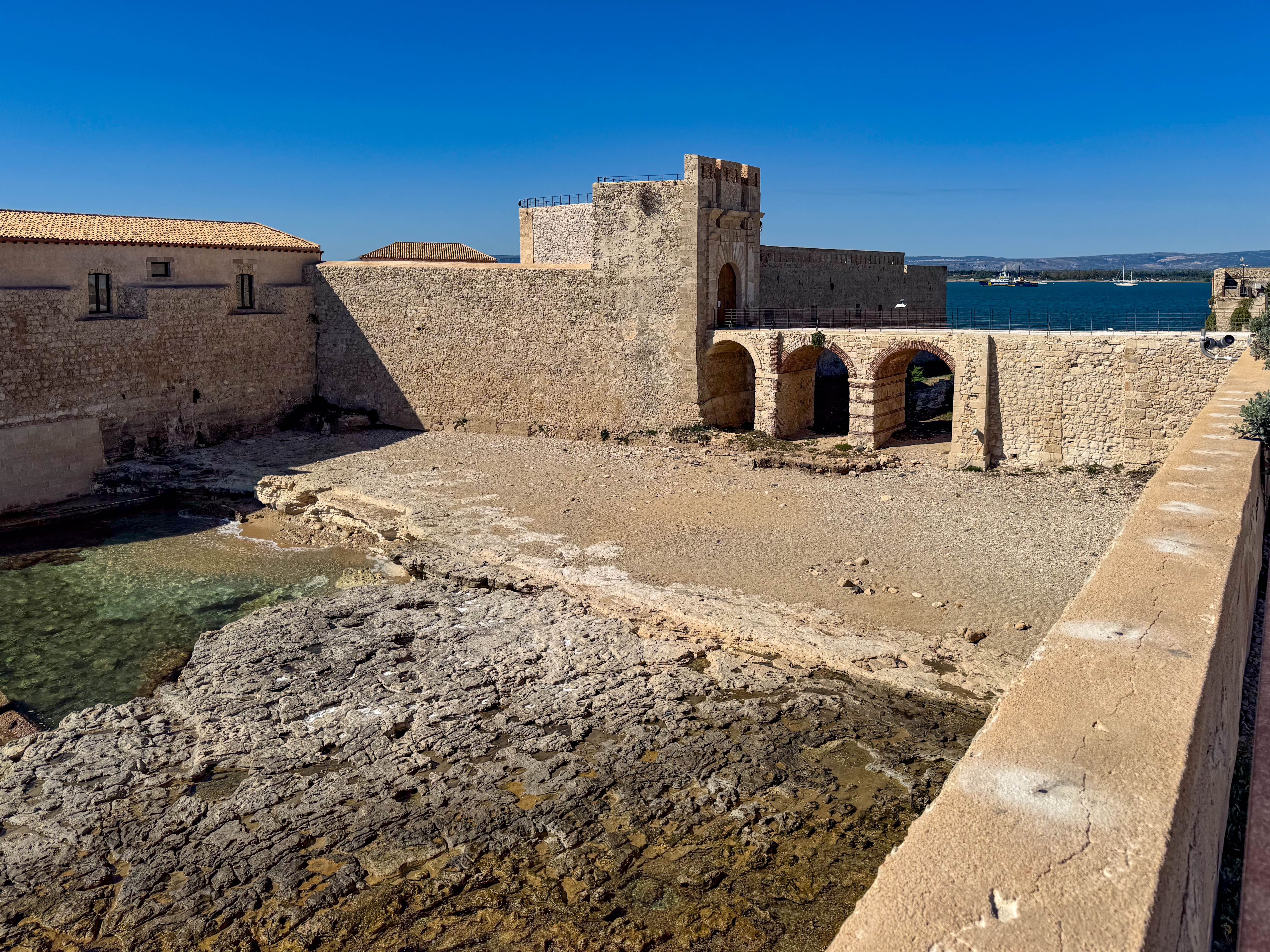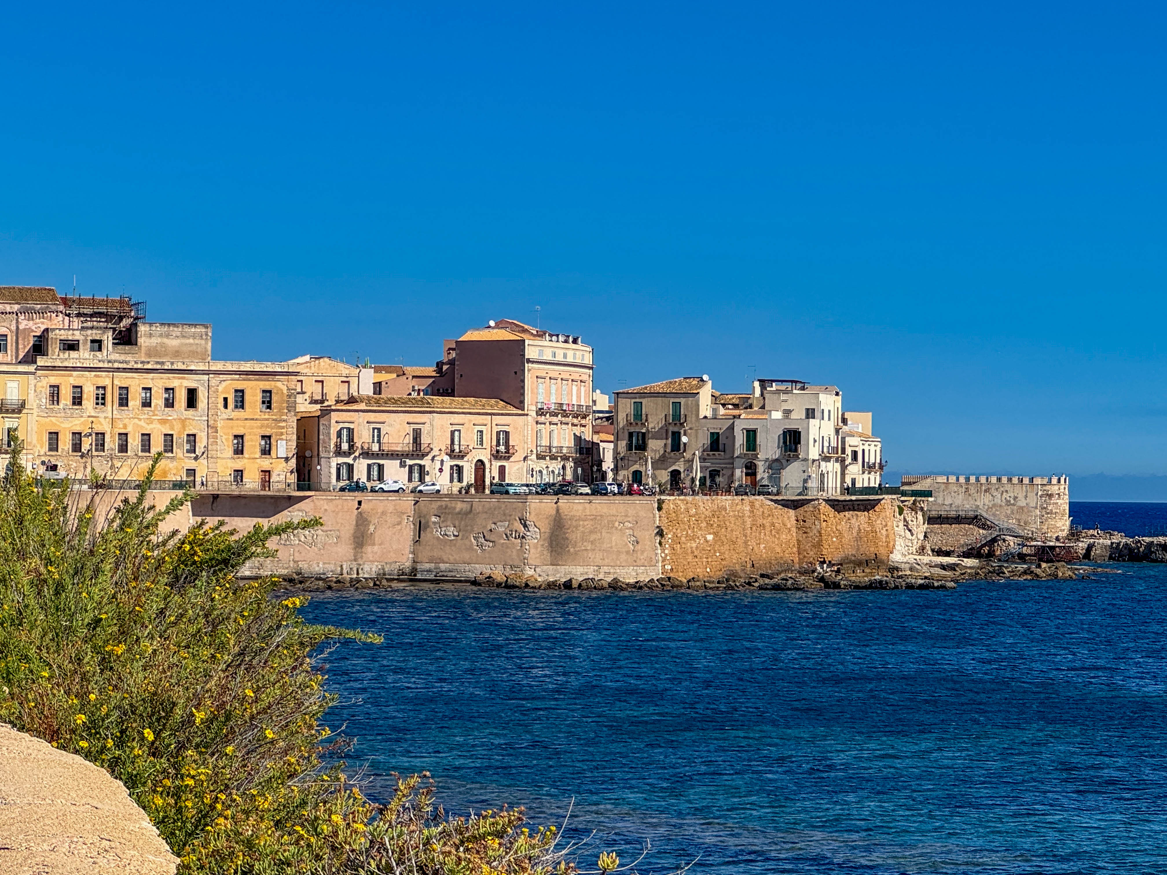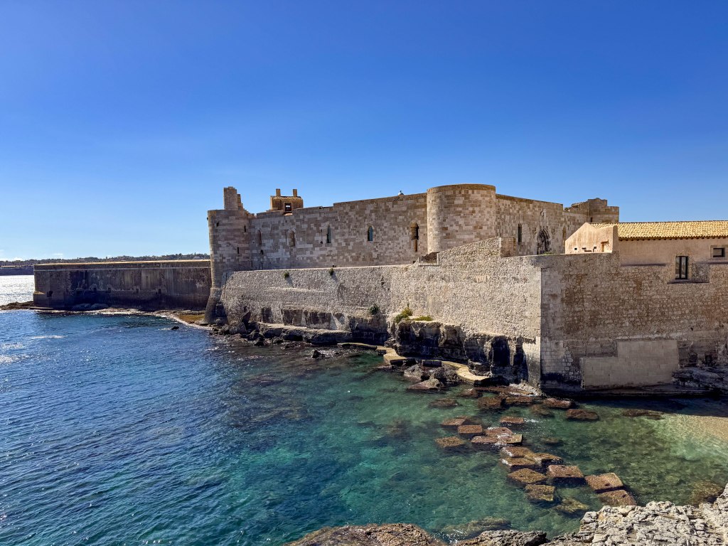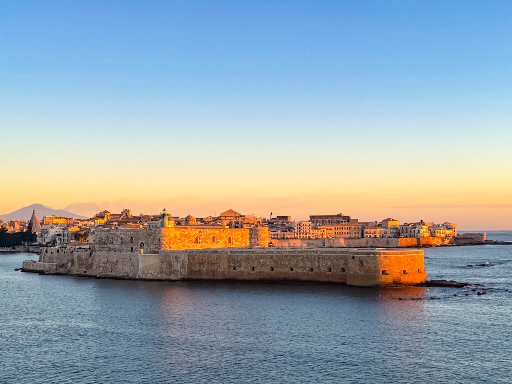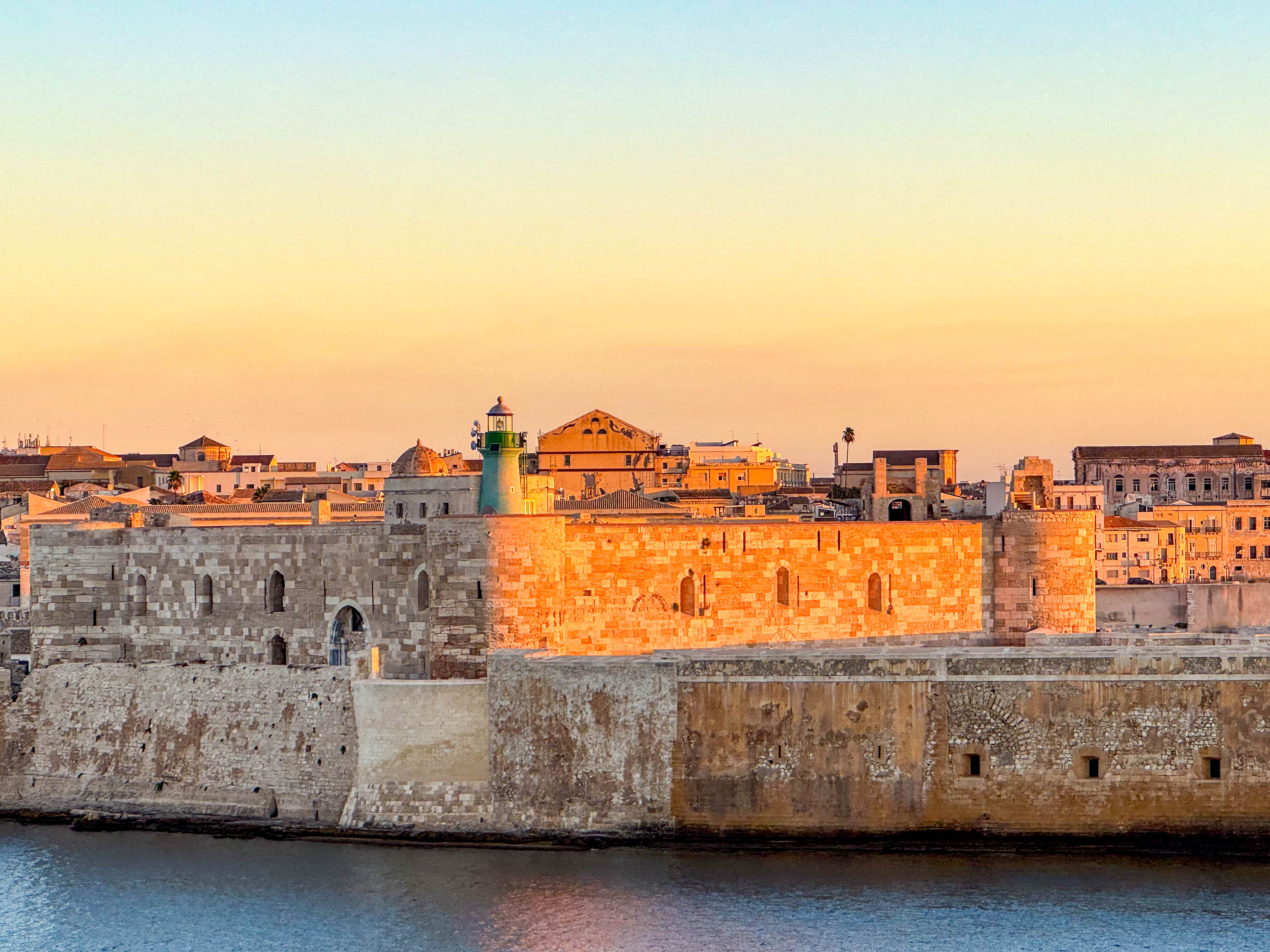 We sailed into the dock just after sunrise and the 13th century Castello Maniace citadel that guards the approach was illuminated nicely.