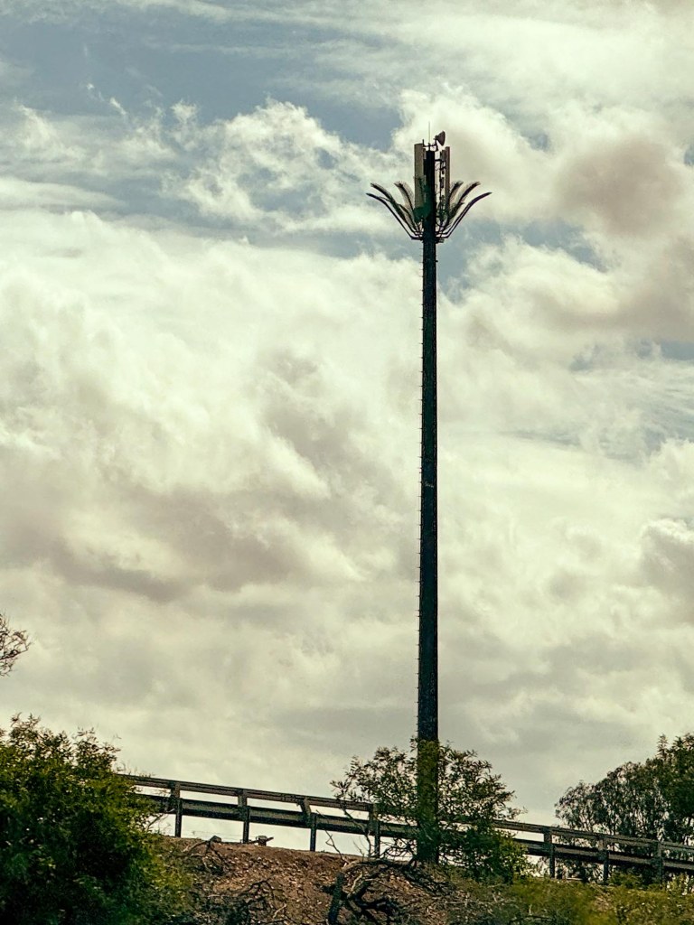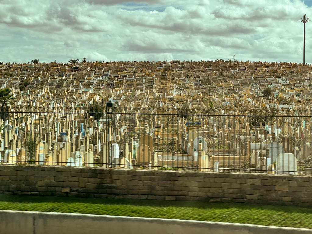 Interesting decoration to disguise mobile phone towers as palm trees. And a very large cemetery.
